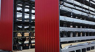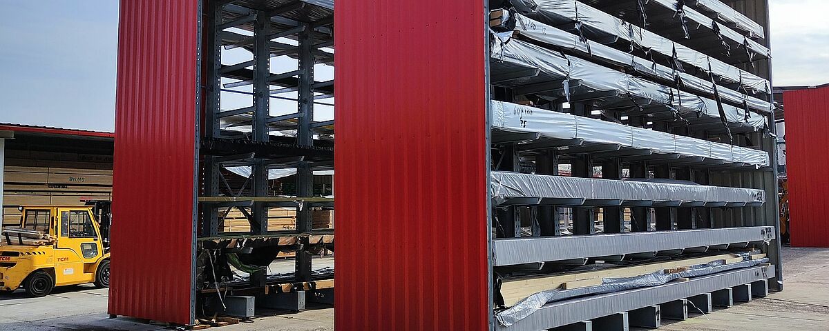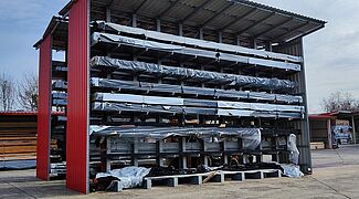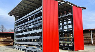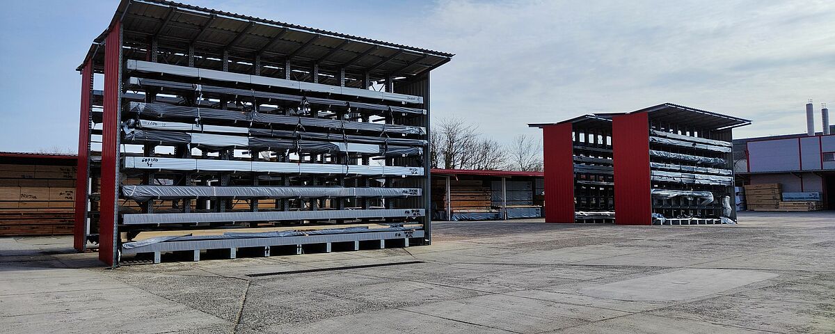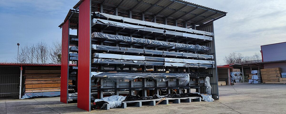 Ve společnosti Borovi dosud skladovali dřevo naskládané pod střechami. Skladování na zemi však zabírá mnoho místa a přístup k jednotlivým položkám vyžadoval opakované doplňování zásob, což zabíralo mnoho času. Obchodník se dřevem se proto rozhodl vytvořit novou skladovací kapacitu pomocí konzolových regálů. Aby bylo dřevo chráněno před povětrnostními vlivy, byly regály na obou stranách opatřeny střechou o hloubce 2,7 metru. Na přední strany regálů byly namontovány profily s vodicími lištami, na něž jsou uchyceny panely z práškově lakovaných trapézových plechů. Stojany regálů jsou navíc vybaveny U-profily, do kterých lze vkládat desky. Vzniklé boční stěny navíc chrání dřevo před srážkami. Tento způsob výstavby ušetřil společnosti Borovi časově náročnou a nákladnou výstavbu nového skladu.