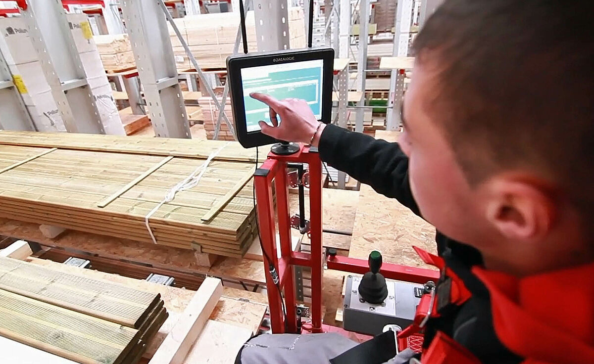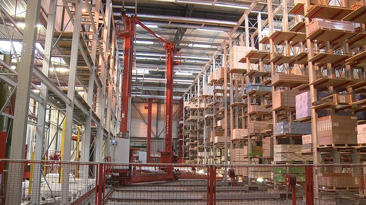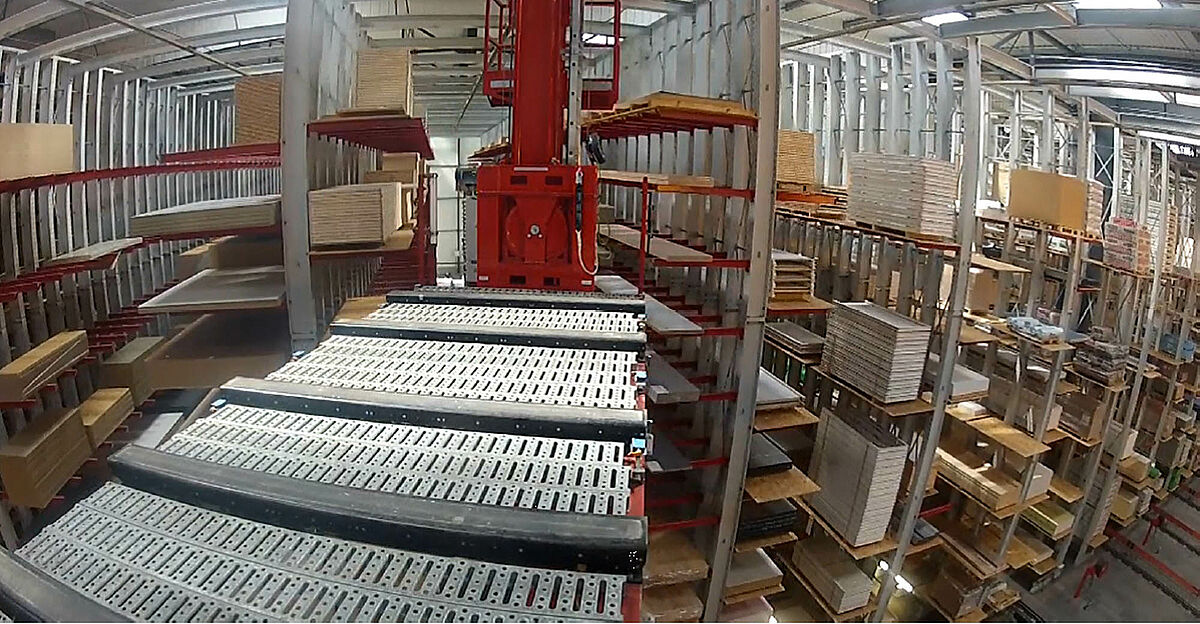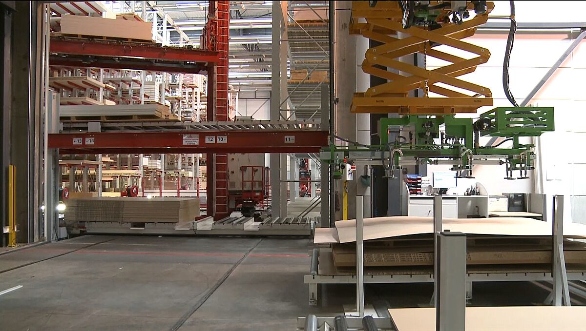V zóně 1 převezme zaskladnění a vyskladnění až 5,1 metrů dlouhých a až 5 tun vážících balíků s dřevotřískovými deskami nebo paletovanými plovoucími podlahami plně automatizované regálové obslužné zařízení. Pro zatáčky koncipovaná RBG přitom obslouží všechny tři uličky tohoto úseku skladu. Zboží je vyskladňováno buď pro zákaznické zakázky, nebo pro výrobní zakázky ve vlastním přířezu. Řetězové a válečkové dopravníky přebírají zboží od RBG a transportují je k odpovídajícím pracovním stanicím.