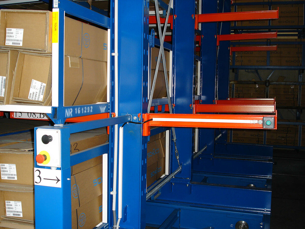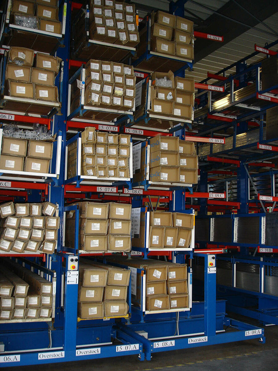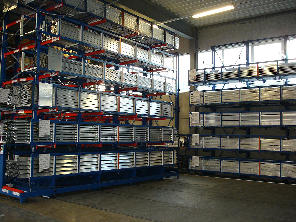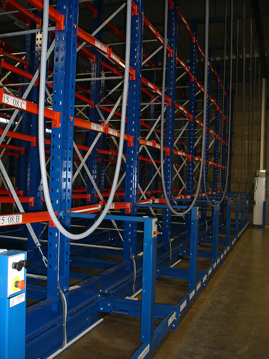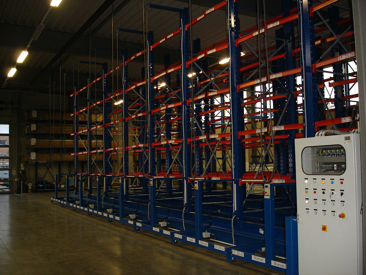 Na základě dialogu se zákazníkem bylo vypracováno několik možností racionálního skladování výrobků. Optimálním řešením se staly konzolové regály na pojezdovém zařízení. S tímto skladovacím systémem je možné na velmi malé ploše získat velkou skladovací kapacitu. Jednotlivé uličky mezi jednotlivými regálovými řadami byly naplánované tak, aby mohly být nástěnné regály stojící vedle zařízení ovládány zepředu. To by nebylo se staticky namontovanými regály možné.