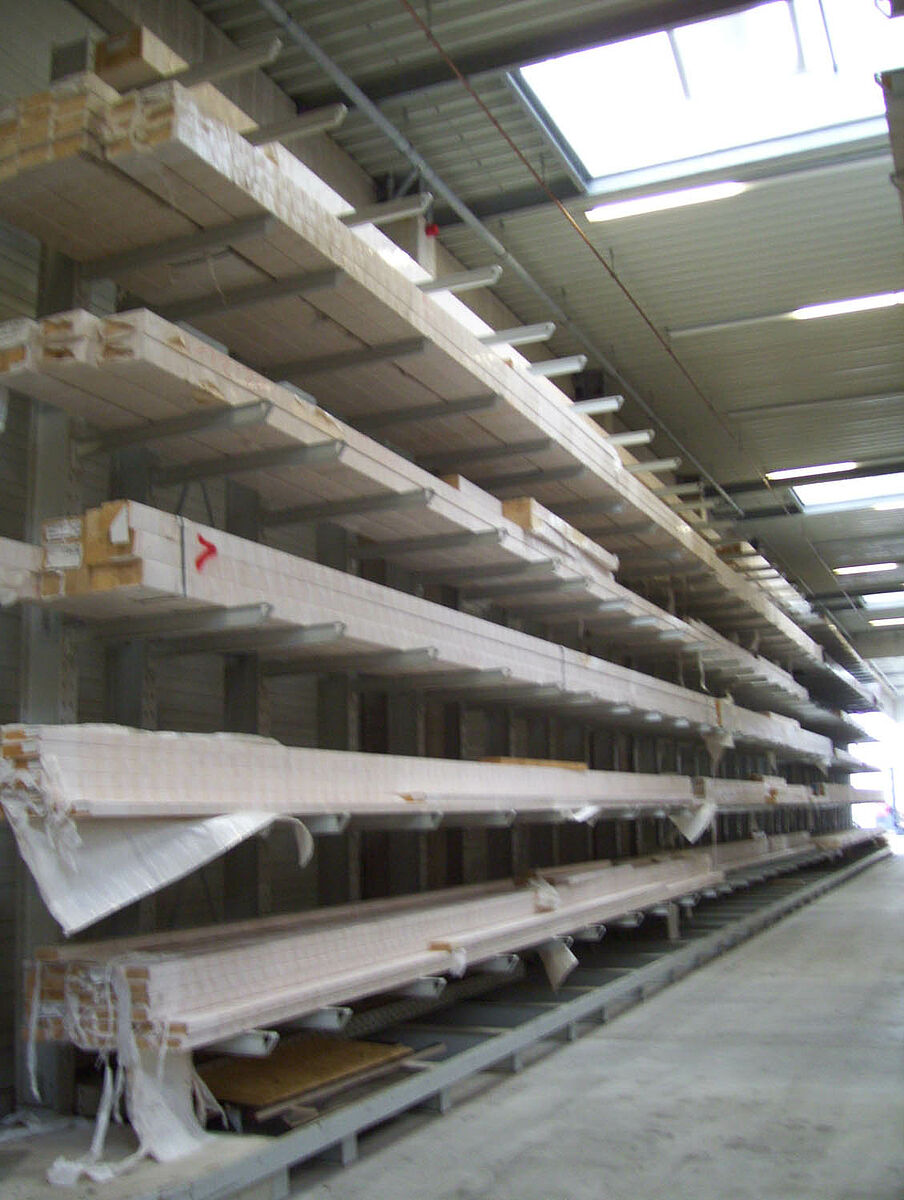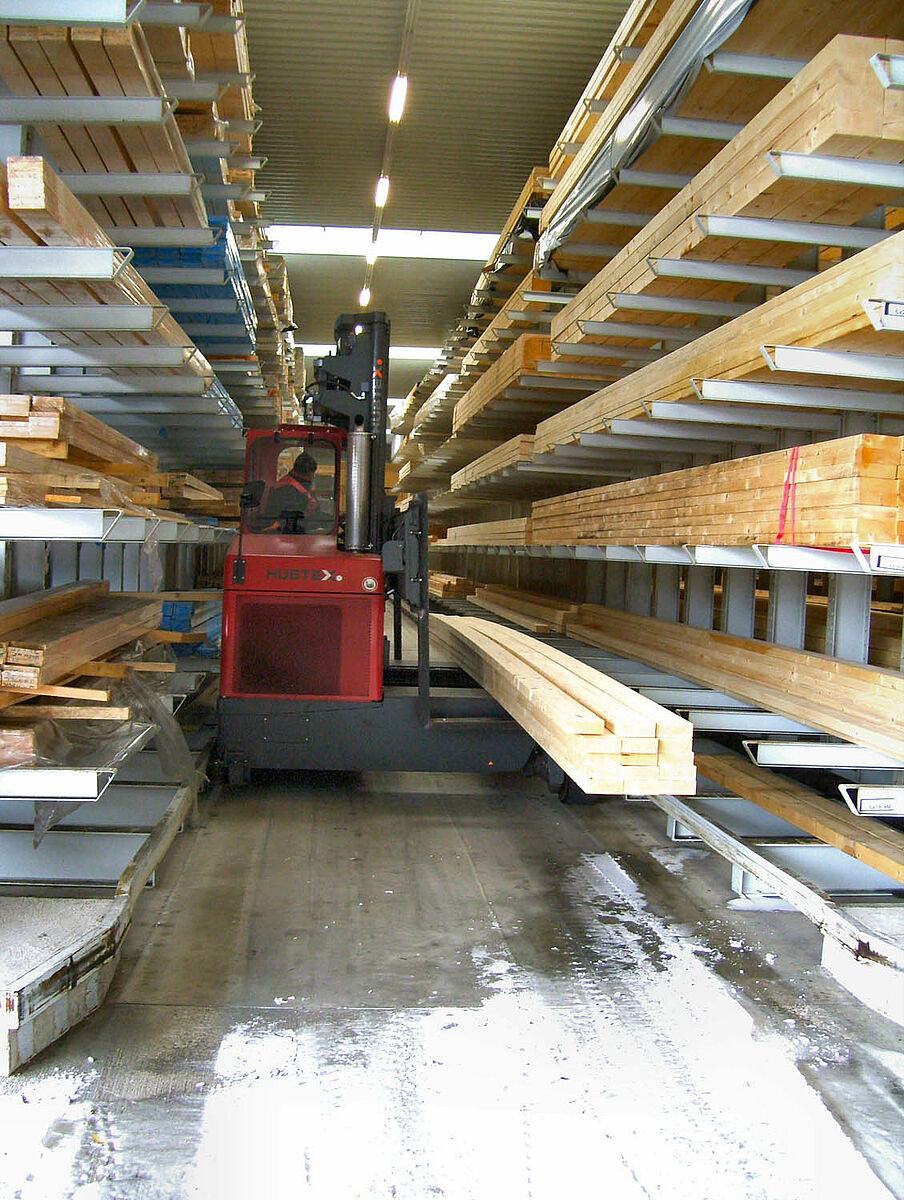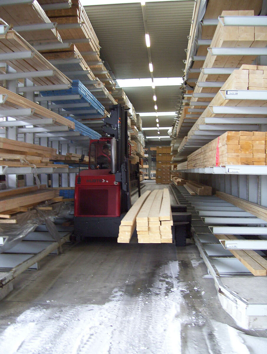 Během pouhých dvou týdnů namontovali potom odborníci z Kerpenu 236 skladových míst pro konstrukční plné dřevo a klížené dřevo ve 40 a 50 metrů dlouhých a 6,2 metrů vysokých řadách konzolových regálů. Celkově tak vzniklo 2.800 běžných metrů regálových pater pro dlouhé dřevo. Dodatečně bylo realizováno ještě 300 úložných míst v paletových a konzolových regálech, ve kterých je skladováno paletové zboží a základní sortiment. Sklad je obsluhován dvěma Hubtex bočními a jedním Linde čelním vysokozdvižným vozíkem. Jenom v prvních šesti měsících po uvedení do provozu bylo ve skladu přeloženo již kolem 3.300 kubických metrů dřeva.