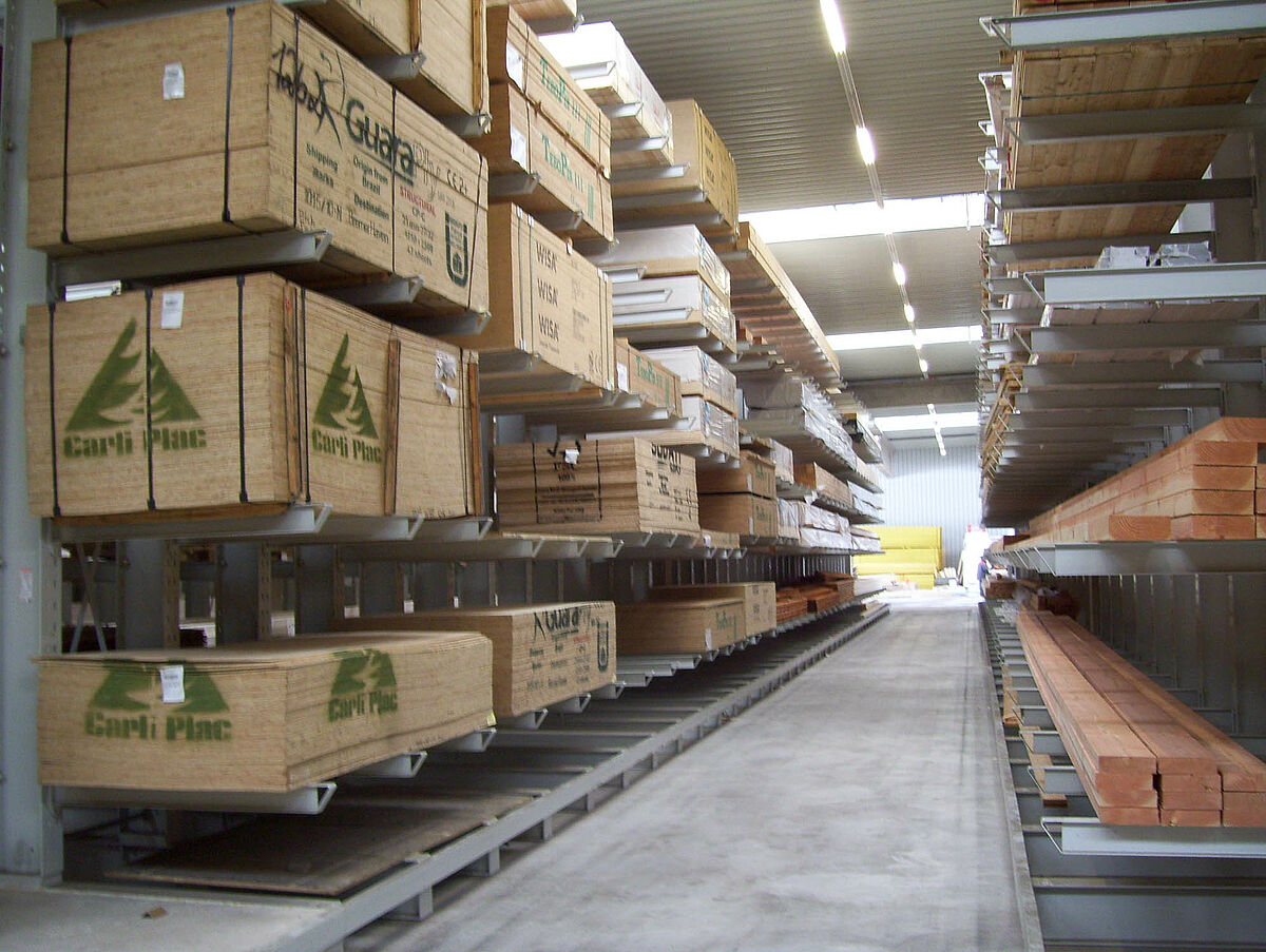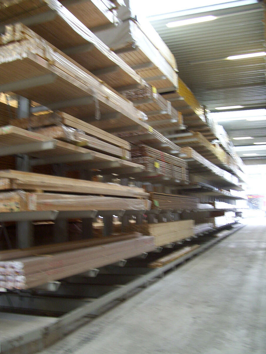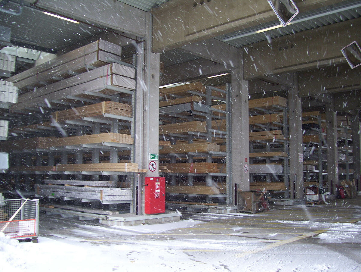 Během pouhých dvou týdnů namontovali potom odborníci z Kerpenu 236 skladových míst pro konstrukční plné dřevo a klížené dřevo ve 40 a 50 metrů dlouhých a 6,2 metrů vysokých řadách konzolových regálů. Celkově tak vzniklo 2.800 běžných metrů regálových pater pro dlouhé dřevo. Dodatečně bylo realizováno ještě 300 úložných míst v paletových a konzolových regálech, ve kterých je skladováno paletové zboží a základní sortiment. Sklad je obsluhován dvěma Hubtex bočními a jedním Linde čelním vysokozdvižným vozíkem. Jenom v prvních šesti měsících po uvedení do provozu bylo ve skladu přeloženo již kolem 3.300 kubických metrů dřeva.