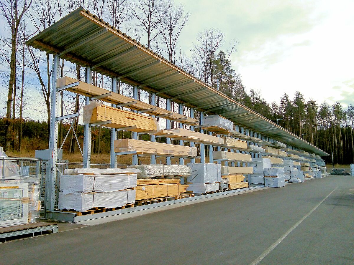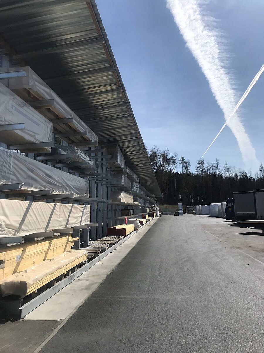 Firma DFH Haus CZ vyrábí zejména montované domy značky Okal – to nejsou projekty sériové výroby, ale individuálně projektované a prováděné, trvale udržitelné domy. Tomu odpovídá také obrovská potřeba skladovacího místa pro materiály určené k výrobě prefabrikovaných komponent. Aby bylo k dispozici dostatek skladových kapacit, nainstalovala firma v roce 2018 první konzolové regály ve venkovním prostoru, které díky žárovému zinkování a šikmé střeše odolají každému počasí. Regály jsou cca 6 metrů vysoké a nabízejí až pět skladovacích úrovní, přičemž každá z konzol dlouhých 1 200 mm unese zátěž až 1 t.