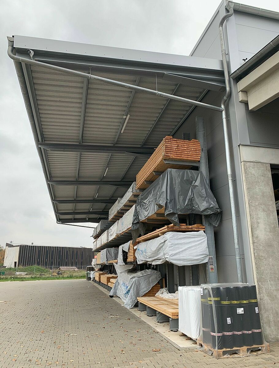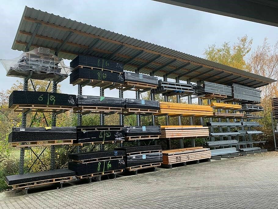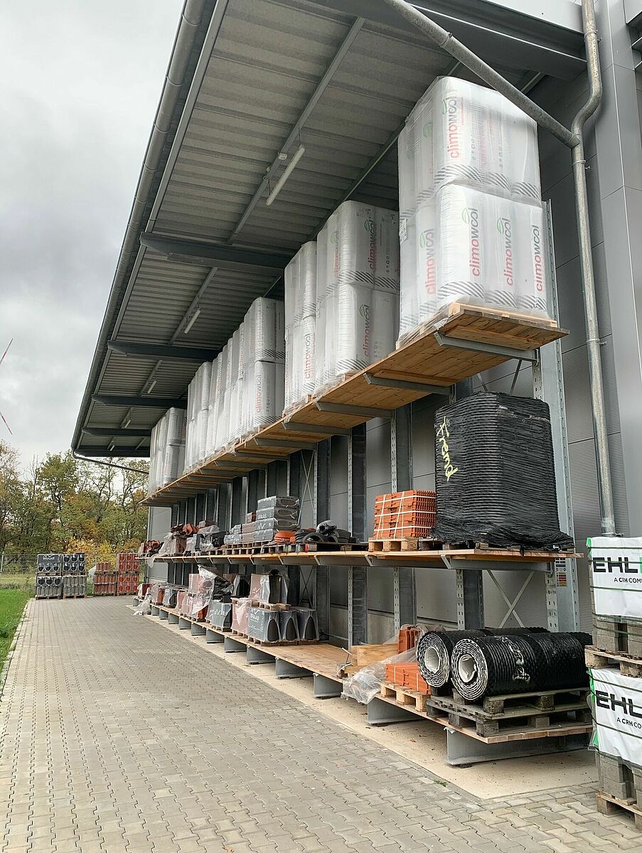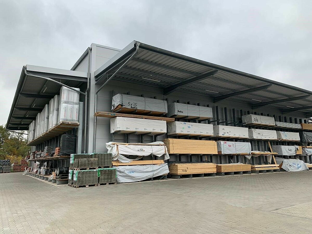 Nově zřízená, 12 metrů vysoká skladištní hala vznikla na ploše 1 000 m2 a nabízí další místo pro nové zboží, jako jsou fasádní panely, izolační desky a konstrukční plné dřevo. Hodně zboží uskladněného nyní pohodlně a bezpečně v regálech se dříve skladovalo venku a na podlaze. Díky paletovým regálům vysokým až 6,58 metru a konzolovým regálům vysokým cca 7 metrů se jednak podařilo rozšířit skladové kapacity, ale také výrazně zlepšit přístup ke zboží. Dohromady společnost OHRA nainstalovala čtyři regálové řady dlouhé cca 18 metrů sestávající z paletových a konzolových regálů a podél vnitřních stěn haly dva konzolové regály dlouhé 25,5 metru se šesti skladovacími úrovněmi. Další konzolové regály nabízejí v exteriéru místo pro nejméně choulostivé stavební materiály.