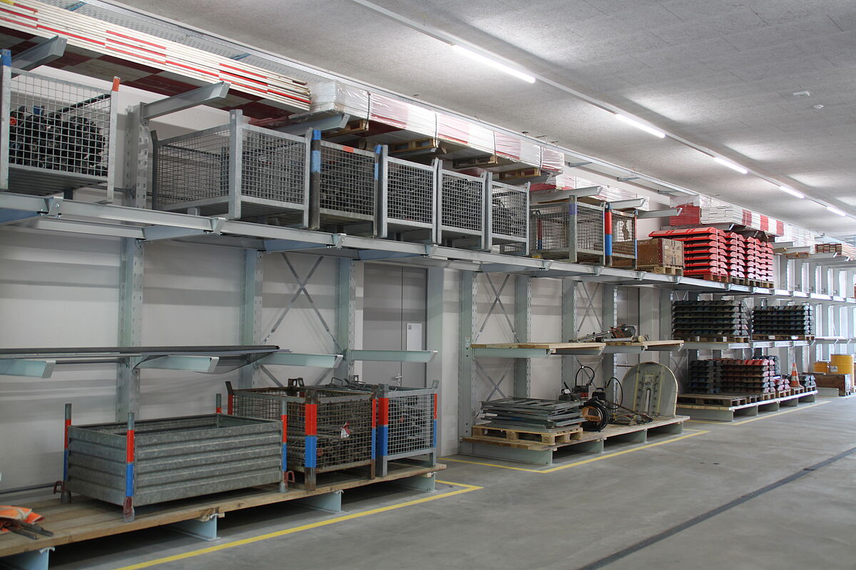 Nádvoří firmy Gottlieb Müller v obci Rothrist slouží od začátku roku 2018 jako operativní platforma pro projekty pozemního a inženýrského stavitelství tohoto podniku. Aby bylo možné efektivně skladovat rozmanitý sortiment stavebního materiálu, rozhodla se firma Gottlieb Müller použít dva typy regálů: skladištní hala je vybavena především 16 paletovými regály, které jsou vysoké 3,5 metru a dlouhé 8,45 metru. Každá police regálu pojme tři europalety nebo mřížové boxy vážící vždy až 1 000 kg. Další skladovací místo v hale nabízí sedm jednostranných konzolových regálů vysokých 3,64 m. Ty mají částečně konzolové spojky a police, díky nimž lze bez rušivých podpěrných sloupků skladovat kromě dlouhého zboží, jako jsou trubky nebo desky, též palety různých rozměrů. Další konzolové regály byly postaveny venku; ty chrání žárové zinkování před korozí. Tady dominuje především regálová řada dlouhá 43,5 metru, jejíž nejsvrchnější konzola je provedena formou střešních konzol: Ty nesou na každé straně mírně skloněnou stříšku hlubokou 2,7 metru. Zde uložený dřevěný materiál je tak chráněn proti přímému vlivu srážek. Konzoly všech regálů mají nosnost 1 200 kg na jedno rameno.