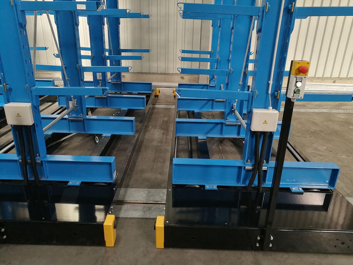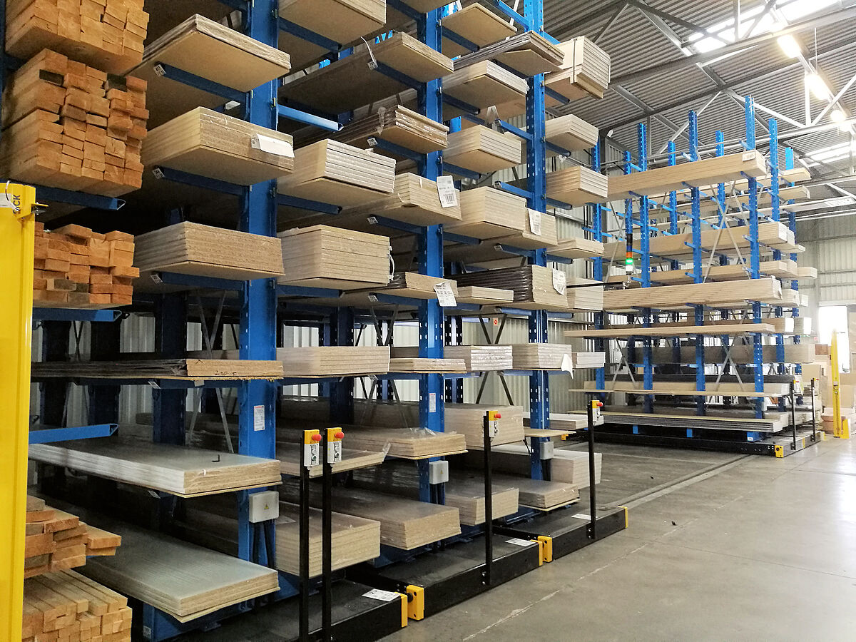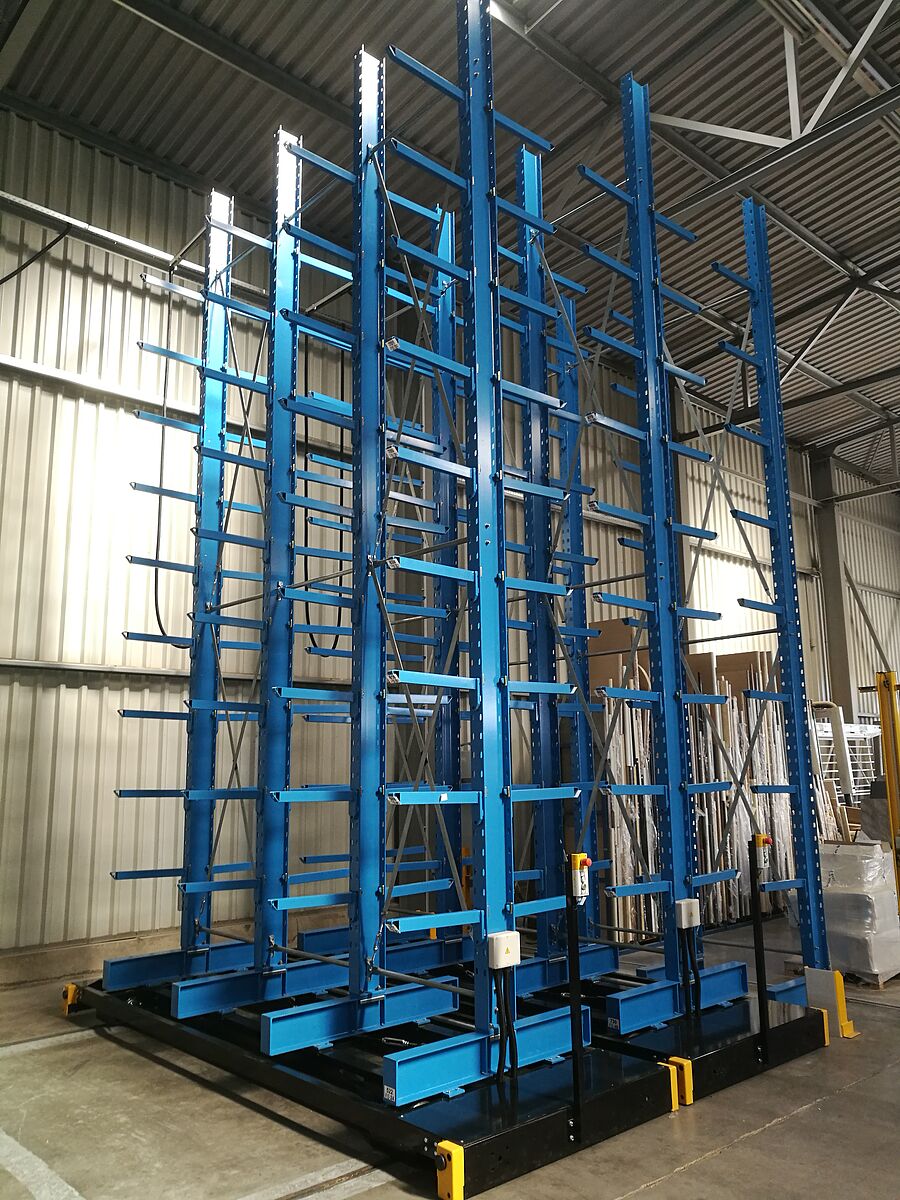 Nový sklad pro kuchyňské pracovní desky má celkem sedm regálových řad. Každá z nich je vysoká 6 600 mm a dlouhá 3 300 mm a má čtyři stojany, na nichž je flexibilně zavěšeno devět konzol. Tím se vytvořilo celkem deset skladových úrovní, přičemž ta nejspodnější leží na patách stojanu. Postranní řady jsou provedeny jako jednostranné a upevněny k podlaze, ostatní řady jsou namontovány na pojízdných podstavcích, které se pohybují po kolejnicích položených v podlaze. Pojízdné podstavce stojí společně s regály, které jsou na nich namontovány, těsně vedle sebe. Pokud je třeba vyskladnit zboží z regálu, pojízdné podstavce vyjedou a otevřou požadovanou uličku. Ovládají se z vysokozdvižného vozíku pomocí dálkového ovladače, obsluhovat je lze ale i ručně. S takovýmto systémem je umožněno maximální možné využití prostoru – ve srovnání s běžnými „pevnými“ regály lze dosáhnout navýšení kapacity skladu o téměř 100 procent.