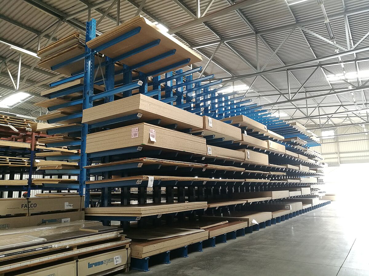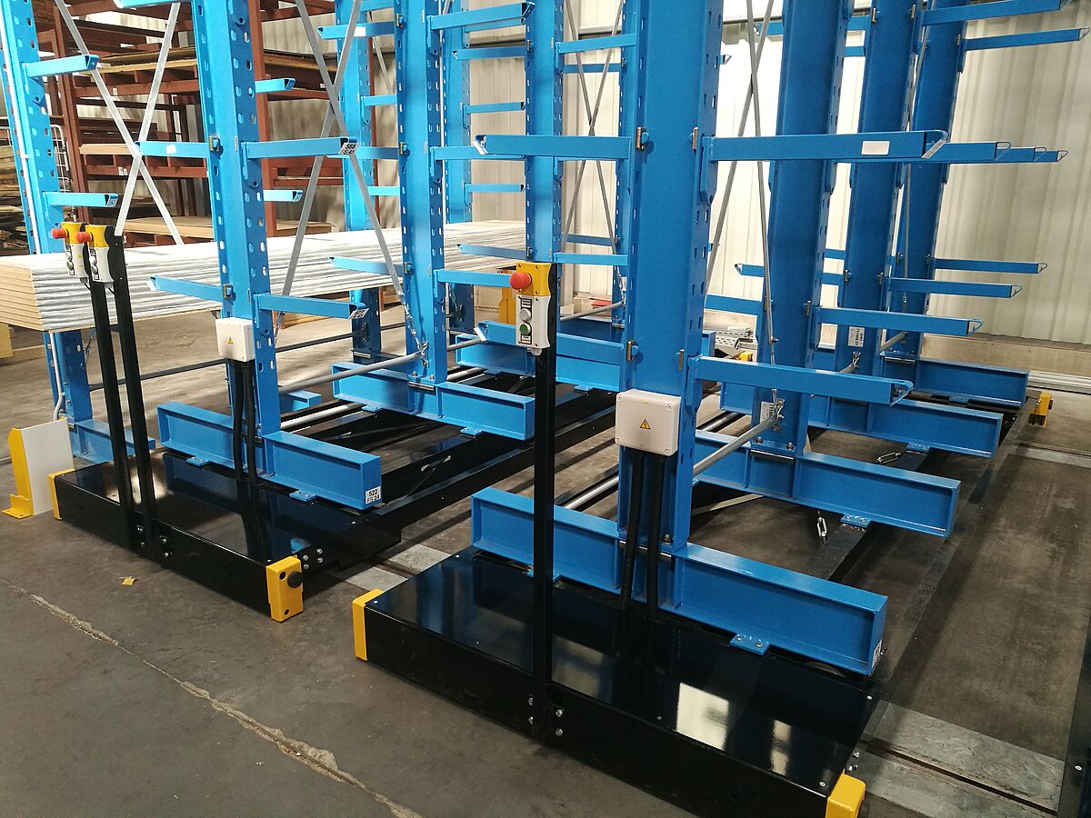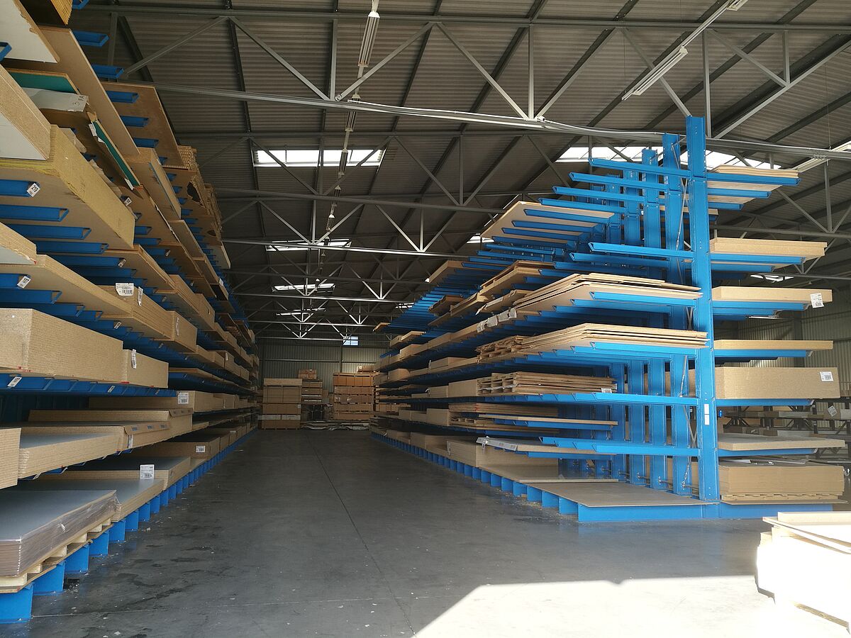 Nový sklad pro kuchyňské pracovní desky má celkem sedm regálových řad. Každá z nich je vysoká 6 600 mm a dlouhá 3 300 mm a má čtyři stojany, na nichž je flexibilně zavěšeno devět konzol. Tím se vytvořilo celkem deset skladových úrovní, přičemž ta nejspodnější leží na patách stojanu. Postranní řady jsou provedeny jako jednostranné a upevněny k podlaze, ostatní řady jsou namontovány na pojízdných podstavcích, které se pohybují po kolejnicích položených v podlaze. Pojízdné podstavce stojí společně s regály, které jsou na nich namontovány, těsně vedle sebe. Pokud je třeba vyskladnit zboží z regálu, pojízdné podstavce vyjedou a otevřou požadovanou uličku. Ovládají se z vysokozdvižného vozíku pomocí dálkového ovladače, obsluhovat je lze ale i ručně. S takovýmto systémem je umožněno maximální možné využití prostoru – ve srovnání s běžnými „pevnými“ regály lze dosáhnout navýšení kapacity skladu o téměř 100 procent.