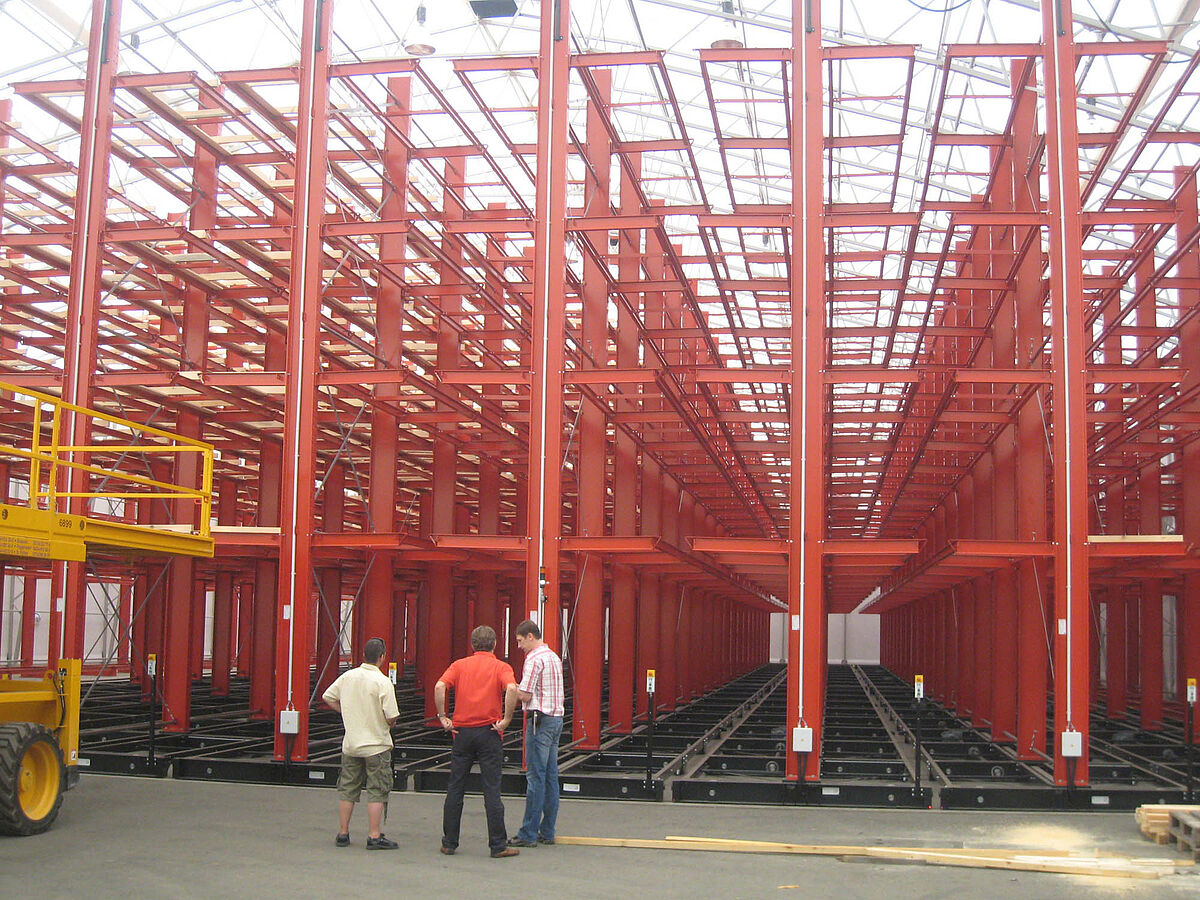 Firma OHRA převzala instalaci kompletního regálového systému. K tomu patřila i montáž kolejí, potřebných pro pojízdné podvozky, která se uskutečnila na volné ploše ještě před stavbou vlastní haly. Z celkem deseti 60 metrů dlouhých a se čtyřmi až pěti úrovněmi až do 9,2 metrů vysokých konzolových regálů byly dva pevně přišroubovány k podlaze. Zbývajících osm bylo namontováno na 58 metrů dlouhé pojízdné podvozky od OHRA. Pojízdné podvozky jsou poháněny elektricky a nechají se posunovat dálkovým ovládáním ze stohovače. Otevírá se pouze požadovaná ulička - tím dojde na existující ploše téměř ke zdvojení skladové kapacity.