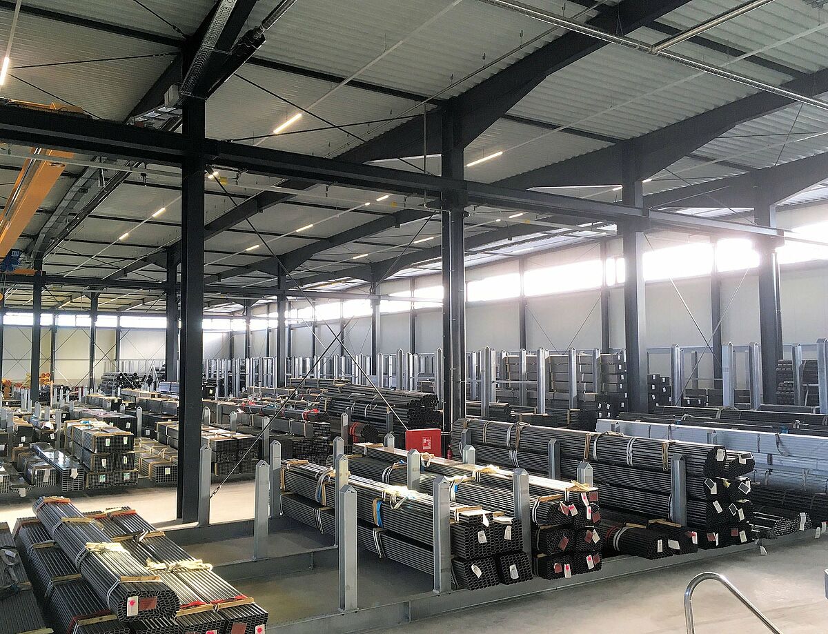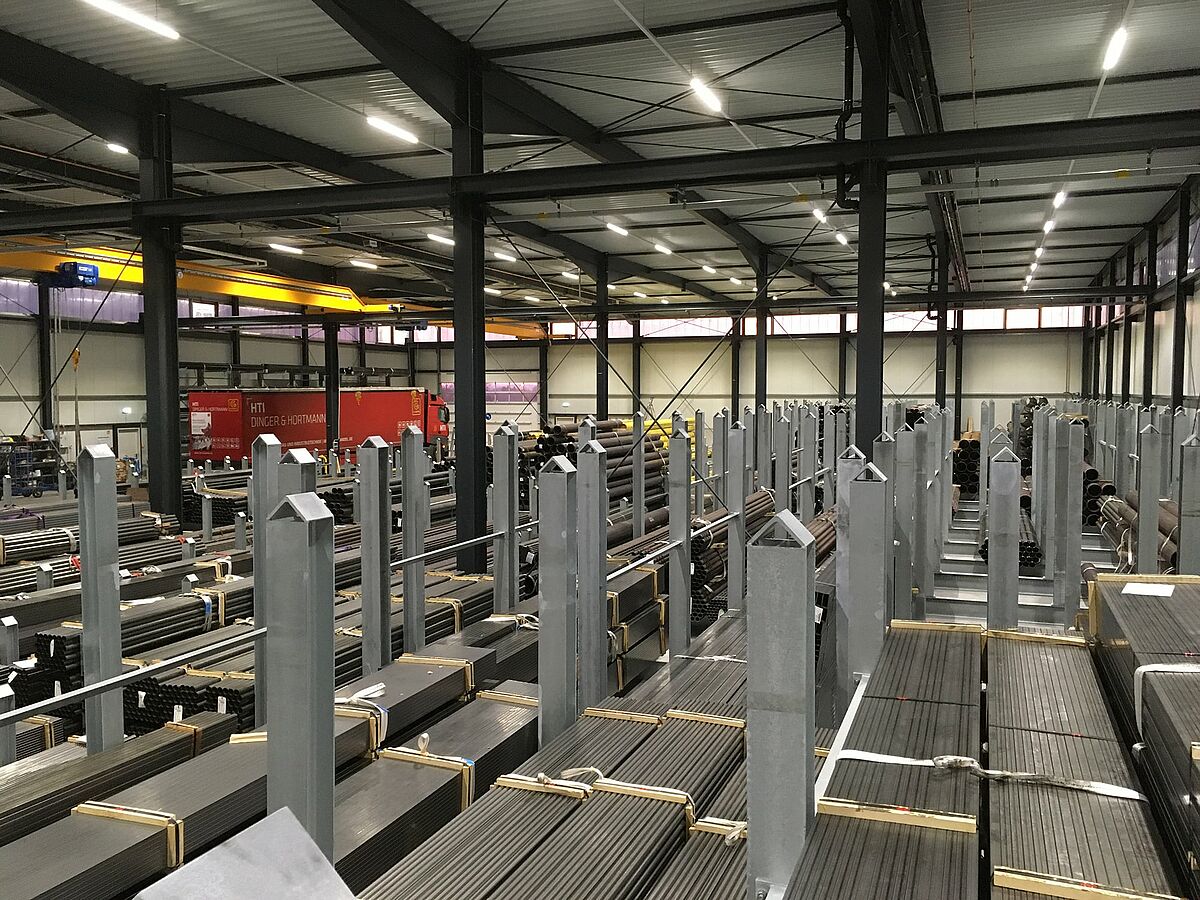 Díky novému centrálnímu skladu trubek v Chemnitzu firma HTI Dinger & Hortmann, specializovaný velkoobchod pro pozemní stavby a průmyslovou techniku, výrazně zvýšila efektivitu svých logistických procesů. Velké množství různě dlouhých a těžkých trubek, popř. svazků trubek je skladováno v 30 klanicových regálech od firmy OHRA. Skladování naplocho umožňuje cílený přísun a odběr jednotlivých typů trubek čtyřmi mostními jeřáby. Trubky lze navíc přepravovat z nákladního automobilu rovnou do klanicového regálu – aniž by se musely otáčet, usazovat nebo použít jiné pomůcky na uchopení břemen. Selektivní přístup k trubkám, ale i jednoduchá manipulace umožňují obzvlášť efektivní logistiku trubek. Kromě toho nabízejí konzolové regály, rovněž od firmy OHRA, na vnitřních a vnějších stěnách haly úsporu místa pro lehčí trubky z plastu nebo tenkostěnné oceli.