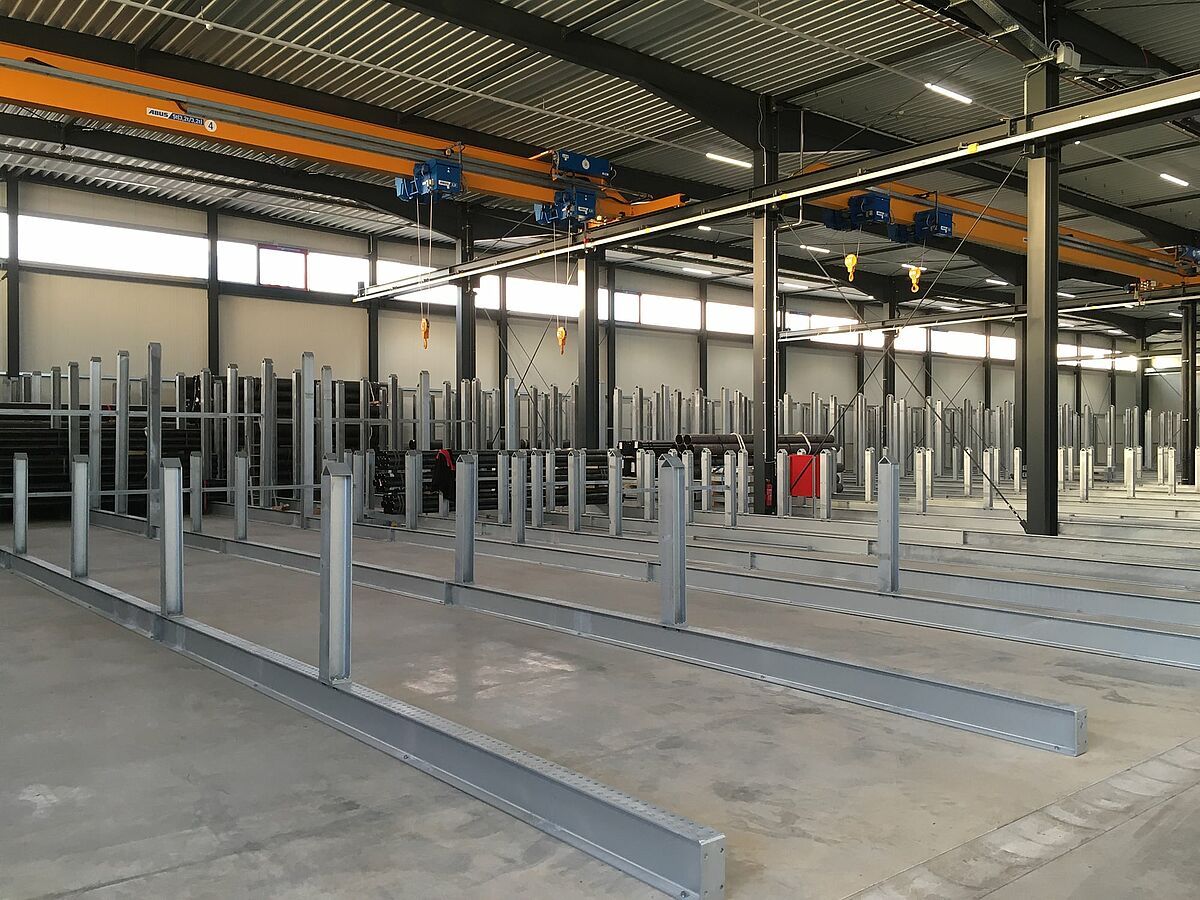 Zatímco těžké a dlouhé trubky, resp. svazky trubek se ukládají do klanicových regálů, lehké trubky jsou skladovány do konzolových regálů značky OHRA. Cca 5 metrů vysoké, pozinkované regály byly jednak instalovány k vnitřním stěnám haly, jednak po celém obvodu vnějších stěn. Vypínací trny a pouzdra na koncích konzol dlouhých 1,4 m dosahujících nosnosti až 640 kg zaručují bezpečné uskladnění trubek.