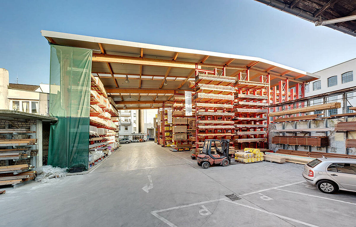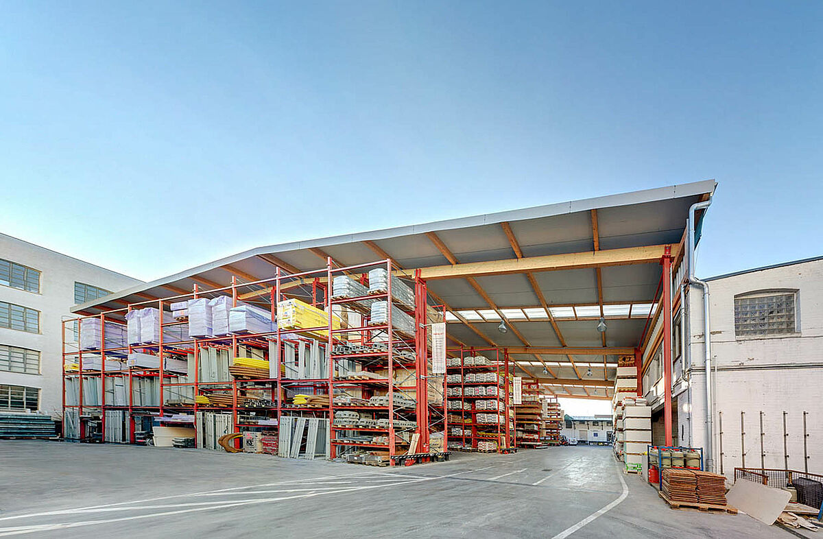 Nově postavená regálová hala je "specialitou" od firmy OHRA. Podpěry a rámy konzolových a paletových regálů slouží vedle funkce skladu jako nosná konstrukce pro střechu a stěnu. Právě dva paletové a konzolové regály nesoucí střechu s výškou 9.500 mm podpírají celou nosnou konstrukci. Dodatečně byla realizována zastřešená nakládací zóna s 10-ti metrovým vyložením. Protože byla střecha provedena pojivo z lepeného dřeva, byl to vlastní výkon zákazníka.