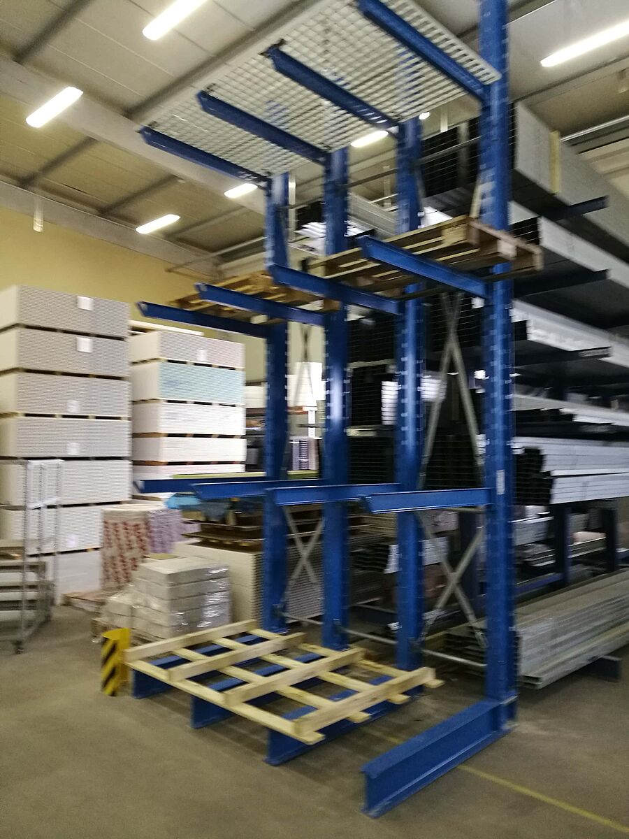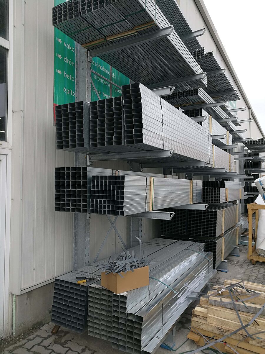 Kvůli úspornému skladování dlouhého zboží – například profilů pro suchou stavbu – namontovala mimo to Lambda v exteriéru různé žárově zinkované konzolové regály od společnosti OHRA. Výška stojanů 4 240, resp. 4 840 mm poskytuje rovněž dobré využití stávající výměry.