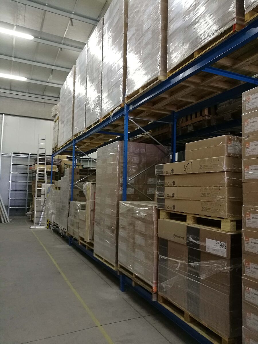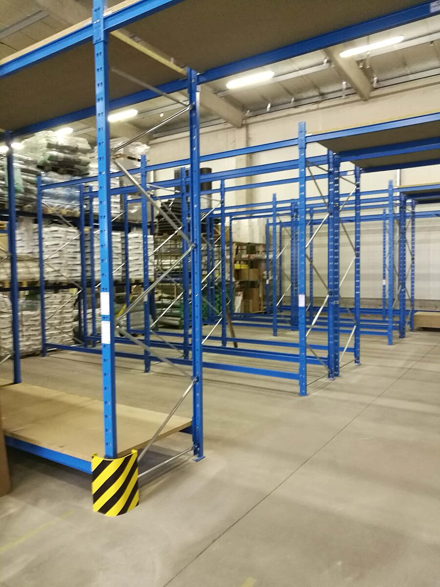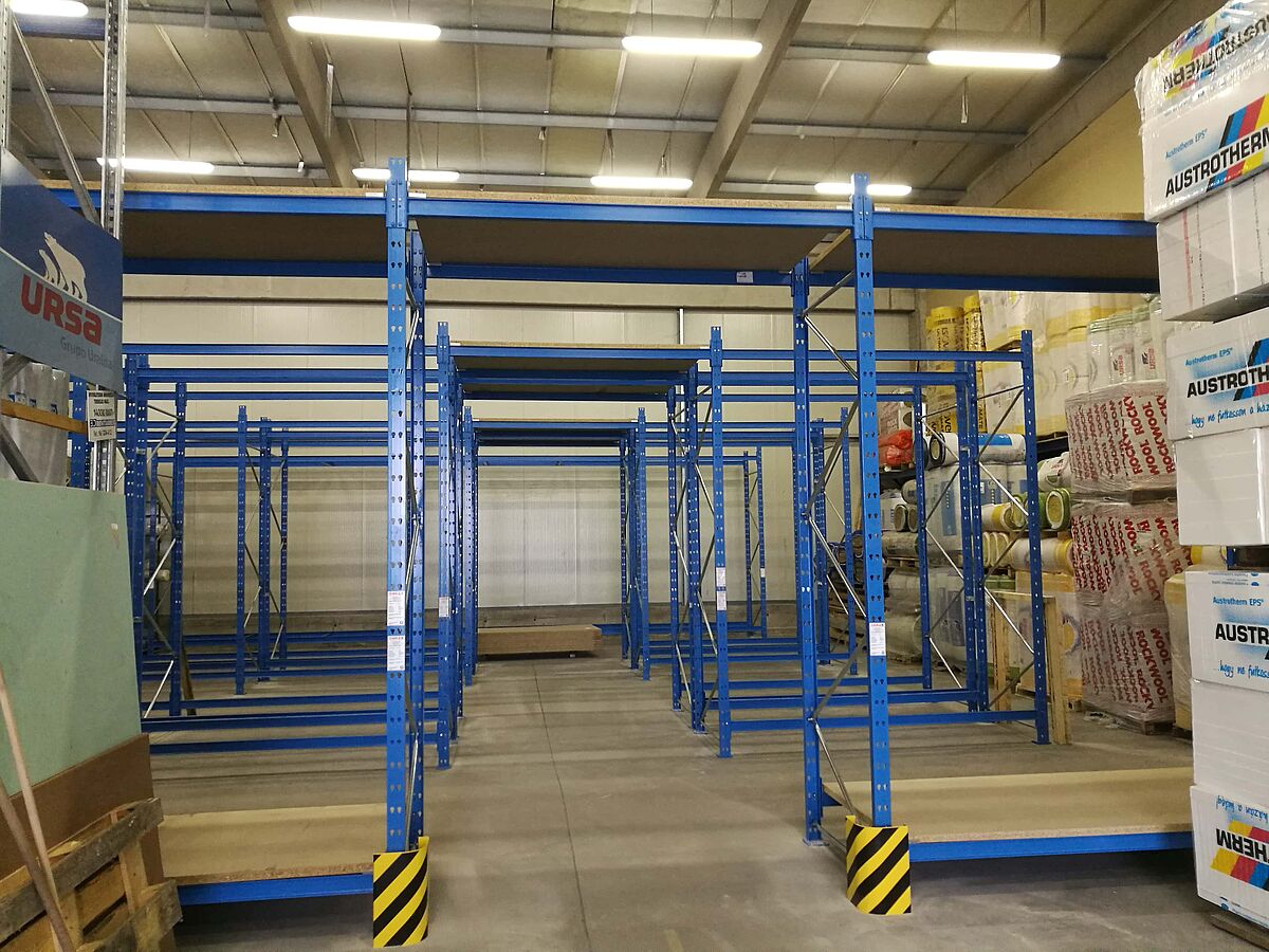 Díky individuálně upraveným paletovým regálům od společnosti OHRA se podařilo vytvořit druhou skladovací úroveň: Pět regálových řad dlouhých mezi 10,6 a 12 metru s výškou stojanů 3 580 mm – která také téměř odpovídá výšce regálu – nabízí místo pro izolační materiály jako minerální a skelná vlna. Díky těmto regálům je nyní možné využít kapacitu skladu skoro až ke stropu haly. Průjezdy široké 2,2 m umožňují rychlý přístup ke všem regálům. Další tři řady paletových regálů poskytují navíc místo pro zboží skladované v paletách.