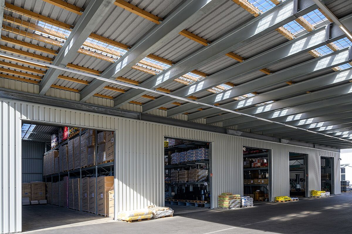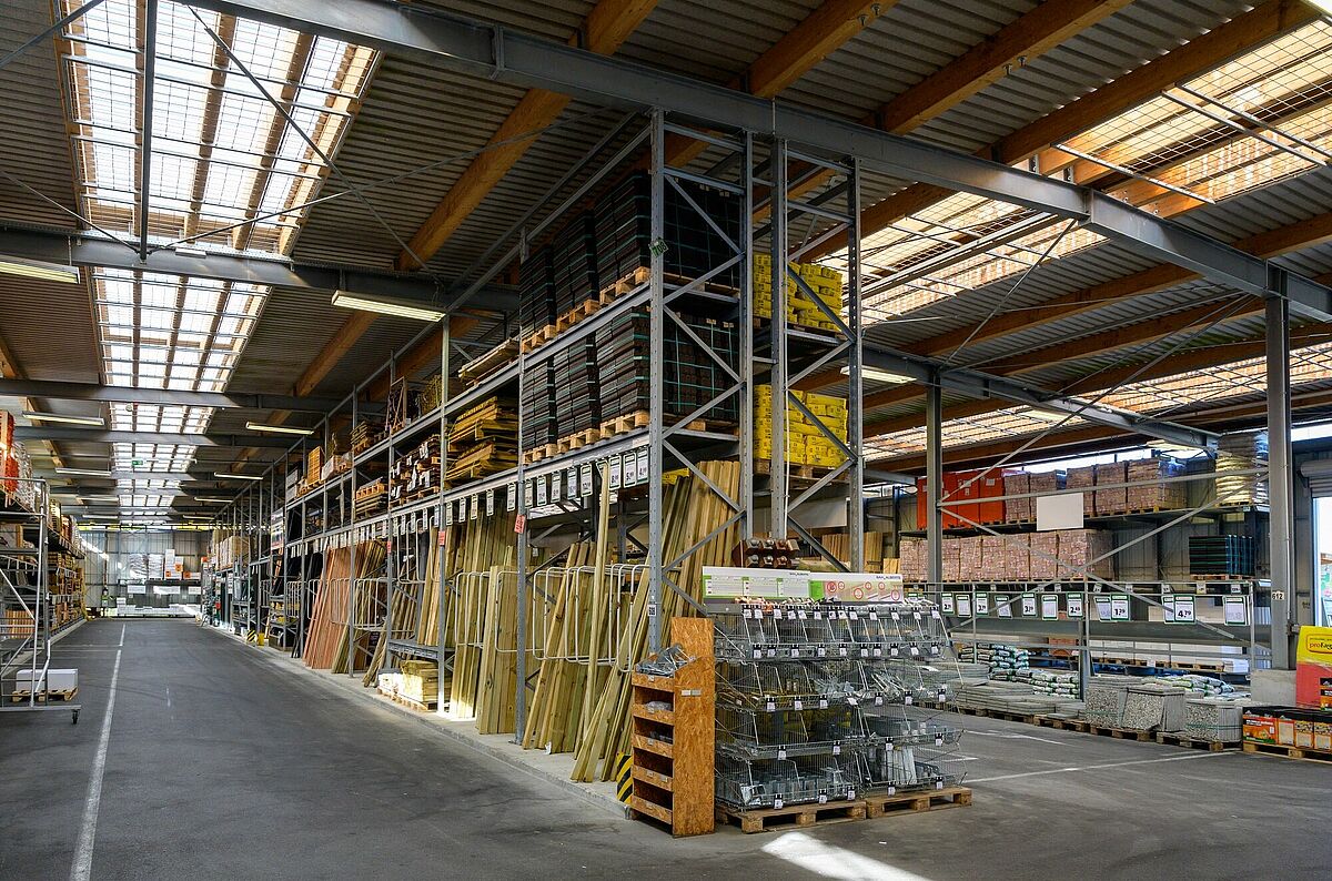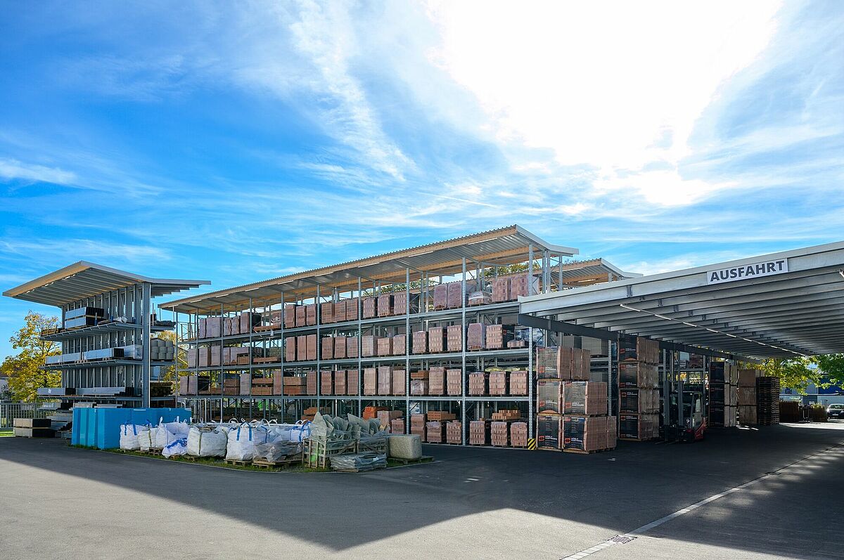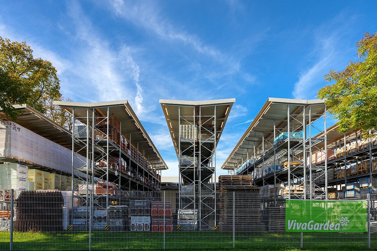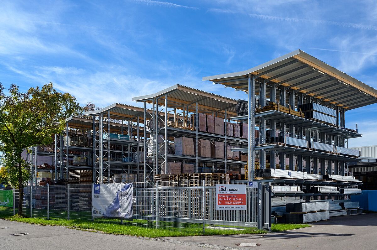 Zajet pohodlně s vozidlem přímo k požadovanému zboží a naložit – právě u neskladného a těžkého zboží jako (zahradnické) stavební materiály nebo dřevo pro použití na zahradě - usnadňuje koncept drive-in nákupu v prodejně stavebnin. Také ve specializovaném obchodě sází Schneider na tento postup. Zákazníci dostanou za každého počasí zboží, které potřebují pěkně připravené pod tříproudou zastřešenou nakládací plochou. Hala byla postavena společností OHRA jako regálová hala: Regálové sloupy přitom zároveň slouží jako nosná spodní konstrukce pro stavbu haly. To zkracuje dobu projektu a nabízí výrazné snížení nákladů. Regálová hala je doplněna o konzolové a paletové regály ve venkovním prostoru, u nichž je zboží díky integrované střeše chráněno před povětrnostními vlivy. Oba prostory jsou spojeny střechou s celkovou šířkou 13 metrů. OHRA navíc realizovala zateplenou halu, kde jsou vedle kanceláří bezpečně skladovány stavební chemikálie a podlahové krytiny.