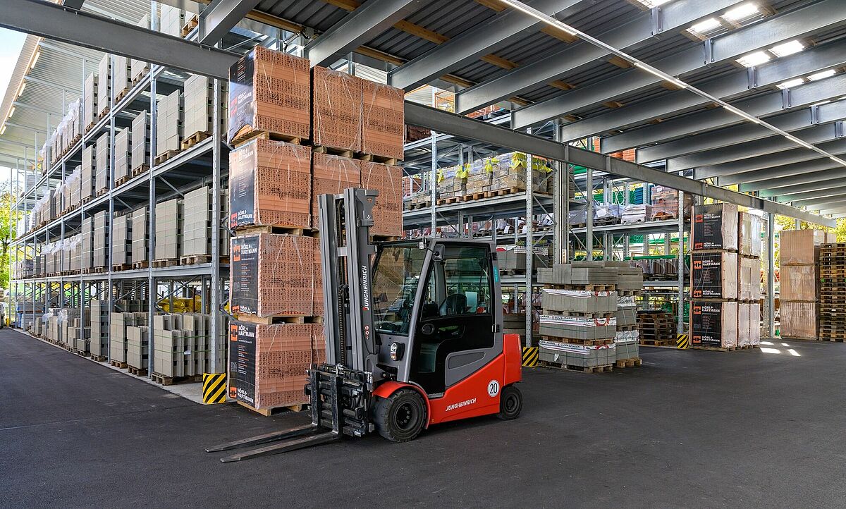 Regály v hale stejně jako i ve venkovním skladu se vyznačují vysokou nosností: Konzolové regály s hloubkou zakládání 1 250 mm mohou být zatíženy až 1,2 t, nosnost jedné buňky paletového regálu činí až 4,5 t. Aby bylo možné flexibilně skladovat rozmanité zboží vedené stavebním centrem Schneider, vybavila OHRA regály mřížovými rošty – tak lze v regálu na jednom místě uskladnit všechno od pytlů s cementem až po europalety.