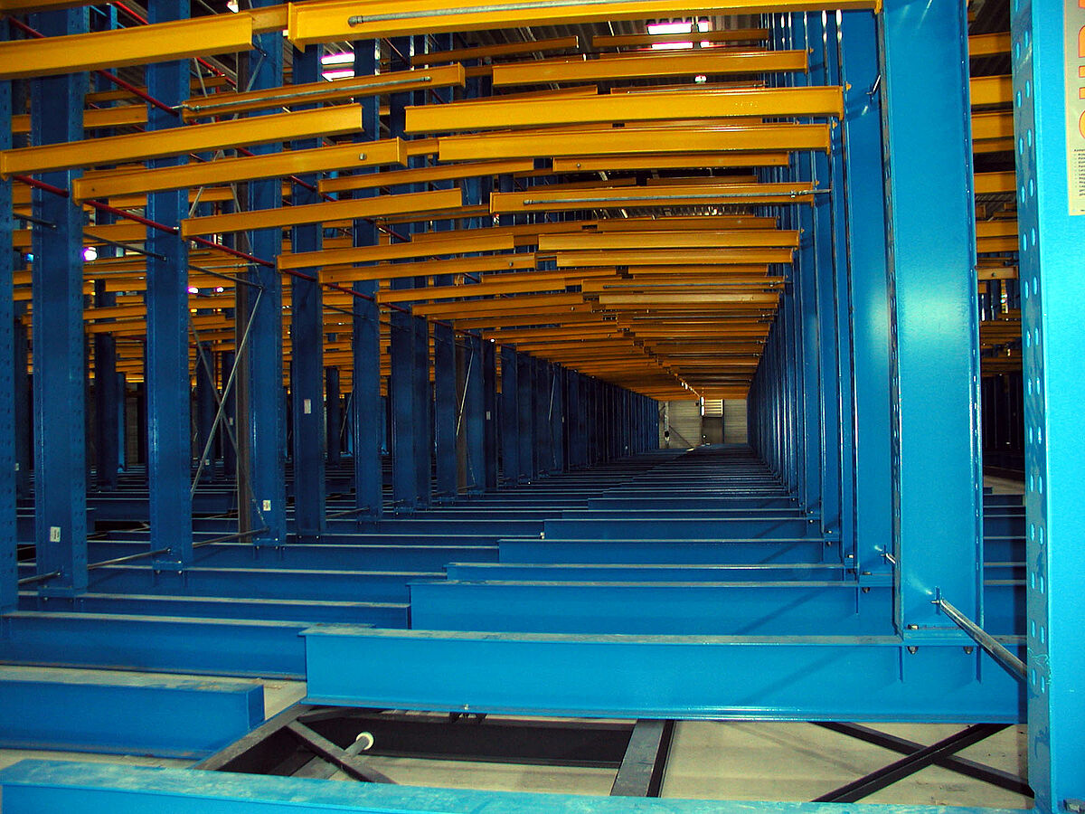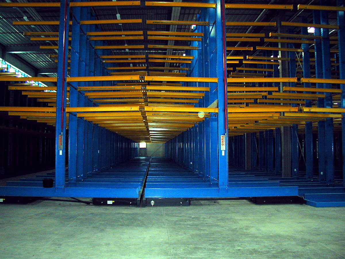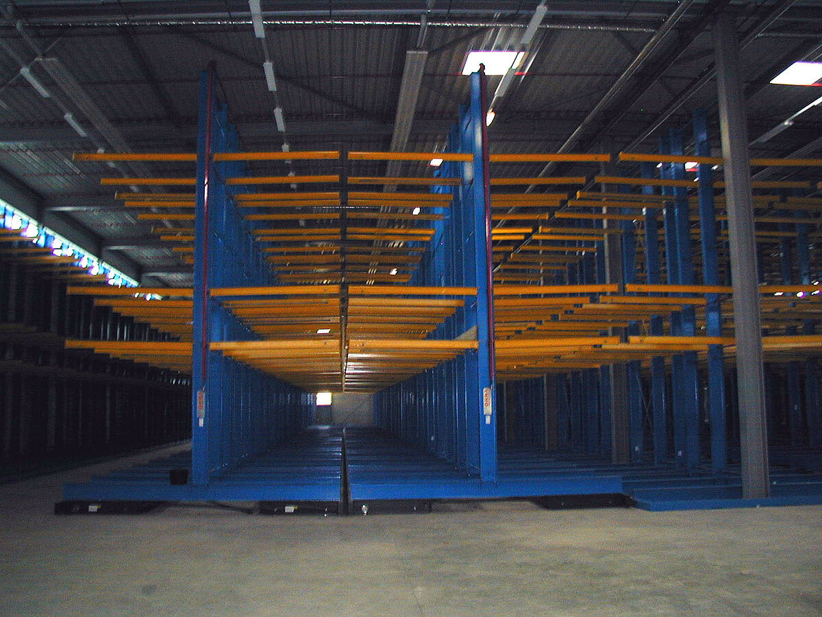 Vzhledem k velkému objemu je skladování kulis velmi obtížné, zvlášť pokud mají zůstat přímo přístupné pro rychlé a co nejméně nákladné střídání na jevišti. Řešením se staly pojízdné konzolové regály. Na 2,5 metr dlouhých ramenech jsou velké palety (2,2 x 6 m)skladovány ve třech podlažích, které každé má výšku 2,1 metru. Ve Státním divadle Karlsruhe je použito 6 pojezdových zařízení, každé o délce 60 metrů s oboustrannými konzolovými regály. Vysoké požadavky na protipožární ochranu byly zvládnuty na základě zkušeností se skladem kulis v opeře v Curychu, pomocí flexibilního systému hadic vedoucího od základnové stanice na pohyblivé pojezdy.