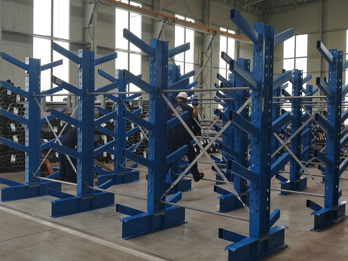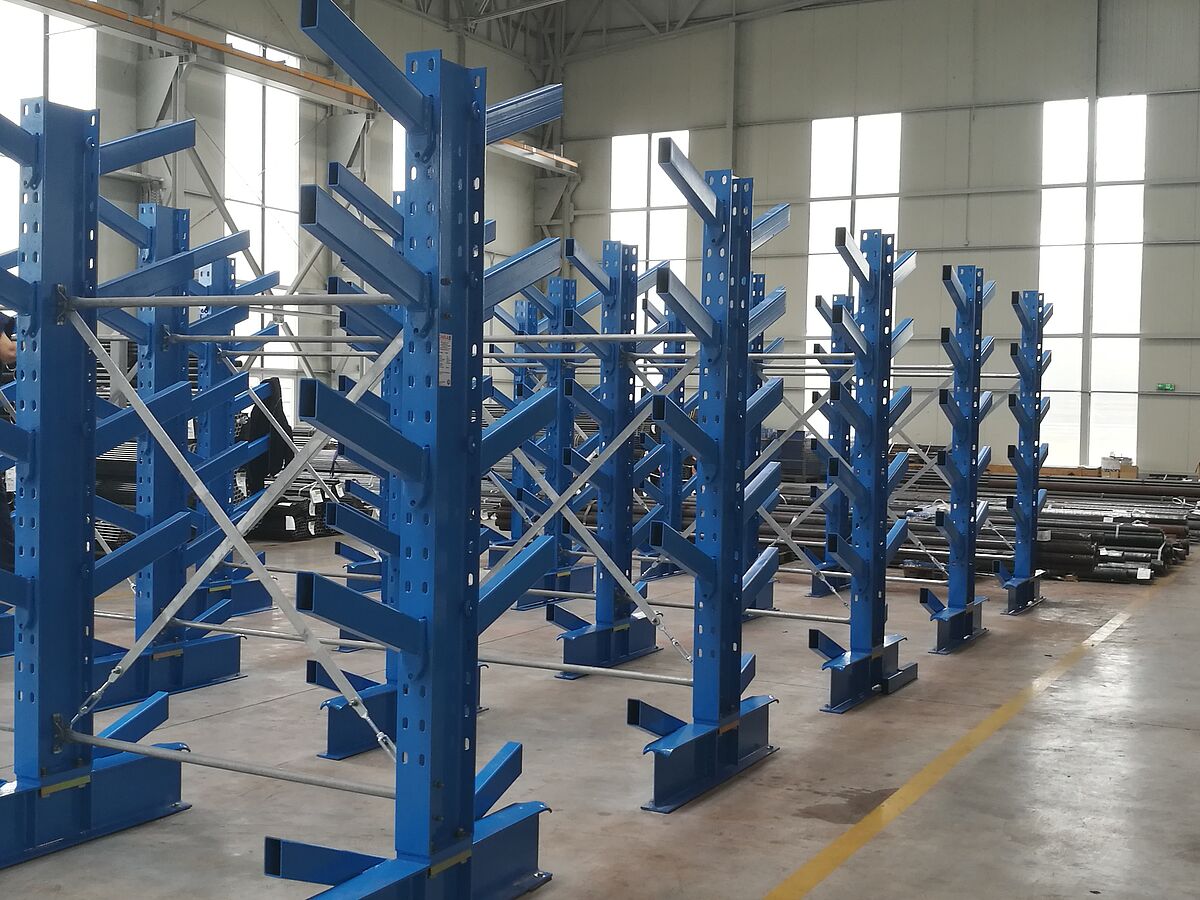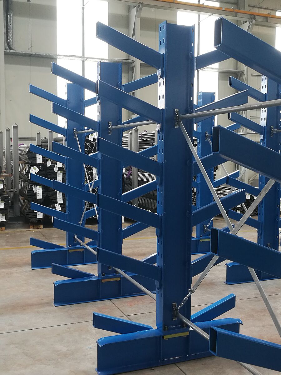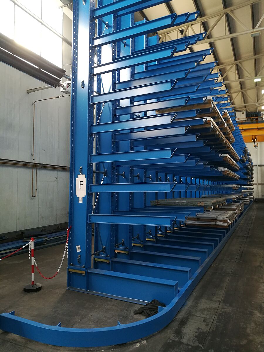 V druhé části skladu OHRA dále nainstalovala sedm řad svých regálů s šikmými konzolami. Zde se pomocí jeřábu uskladňují trubky, profily a tyče. U tohoto typu regálu jsou konzolová ramena vyhotovena s 20° stoupáním. Balík s dlouhým zbožím tak sklouzne do příslušné police. Naskladnění jeřábem se výrazně zjednodušuje. I u regálu s šikmými konzolami jsou ramena zavěšena. Regály namontované v thyssenkrupp Materials jsou vysoké 2,5 metrů a na sedmi policích poskytují místo pro až 6 000 milimetrů dlouhé zboží. Zatížitelnost ramen dlouhých 500 milimetrů je 800 kg.
